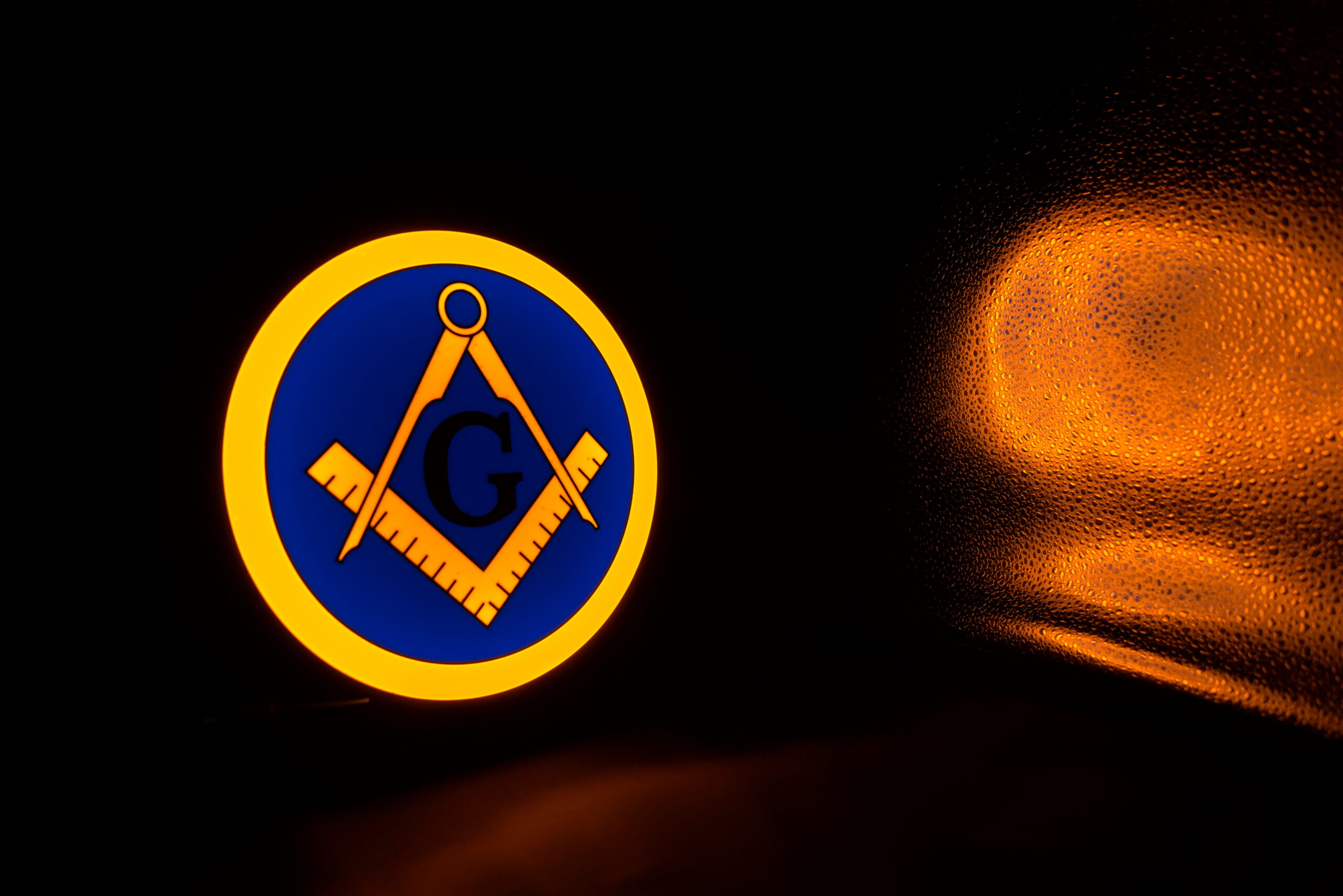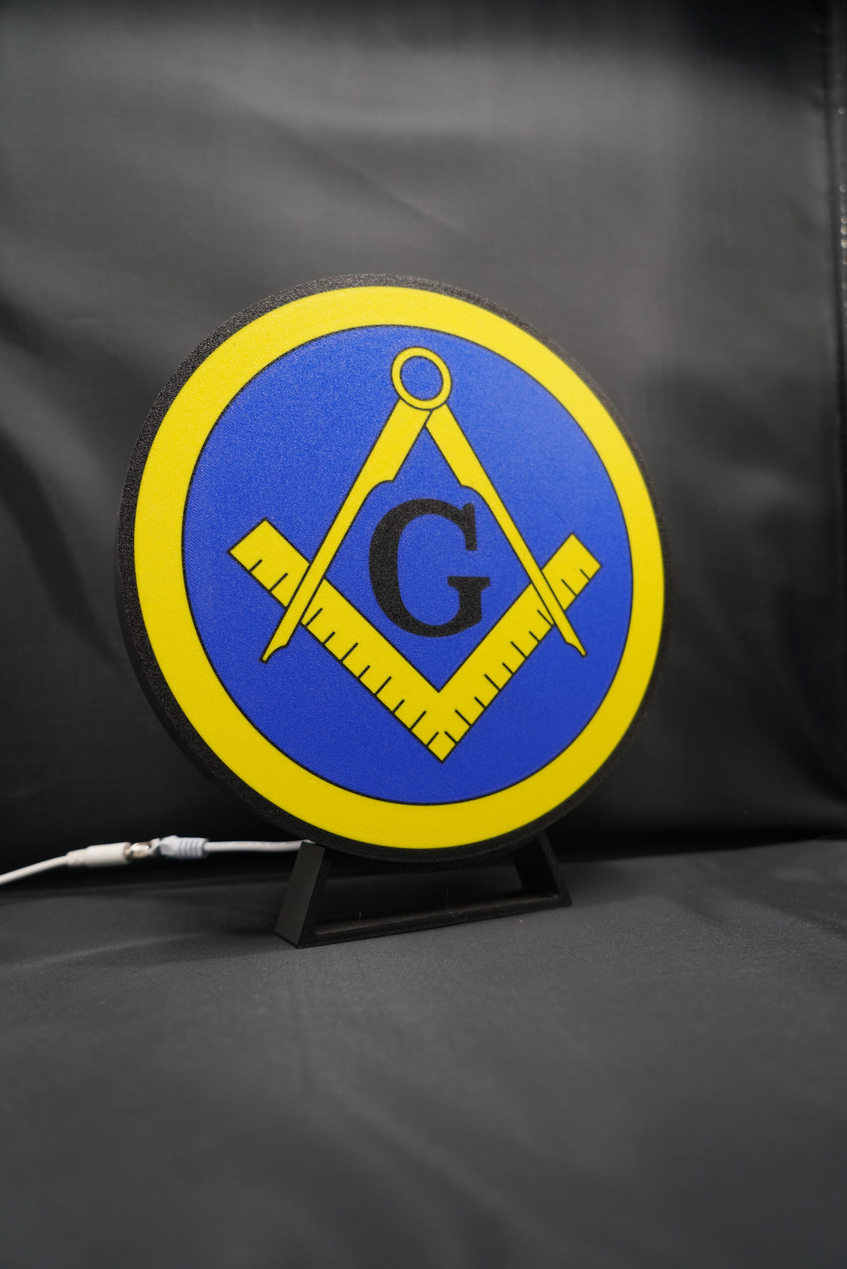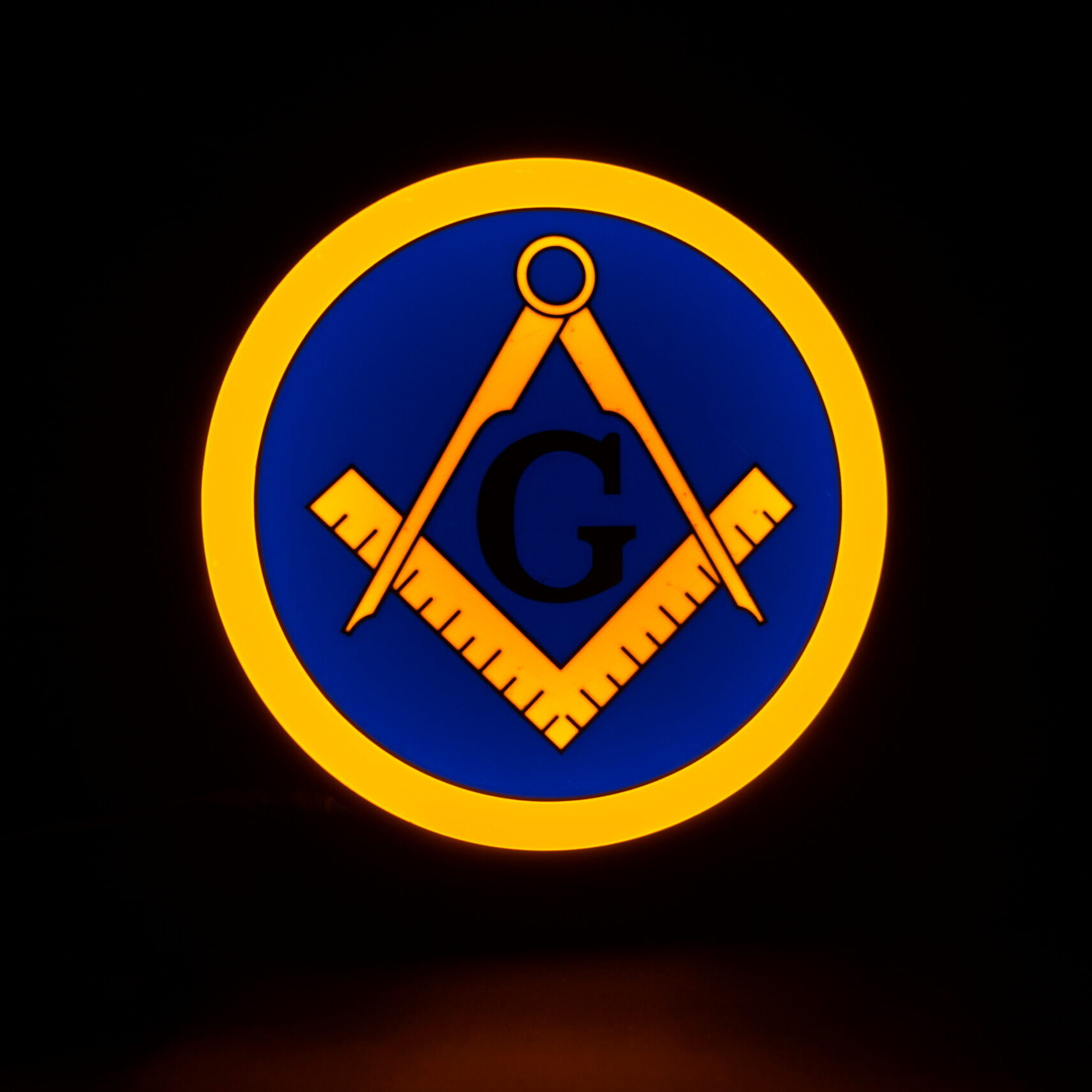 Rundes LED-Leuchtbild im ikonischen Blau-Gelb-Design mit dem Freimaurer-Symbol von Zirkel, Winkelmaß und dem Buchstaben „G“. Das Produkt ist ein hochwertiger 3D-Druck mit integrierter Beleuchtung – perfekt als dekoratives Element für Arbeitszimmer, Logenräume oder stilvolle Wohnumgebungen.
